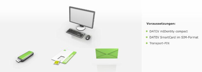 Sie benötigen Datev mIdentity Compact USB Stick, die Datev Smart Card, die einfach eingesteckt wird und die Transport PIN, die Sie bei erstmaliger Nutzung abändern müssen.