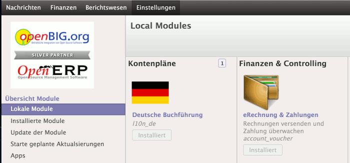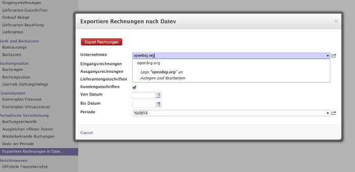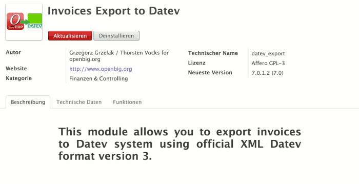 Das Datev Export Modul nutzt als Basis den deutschen Kontenplan. Dieses Modul wurde ebenfalls durch openbig entwickelt und wurde alleine im ersten Halbjahr 2013 ca. 1000-mal heruntergeladen.
