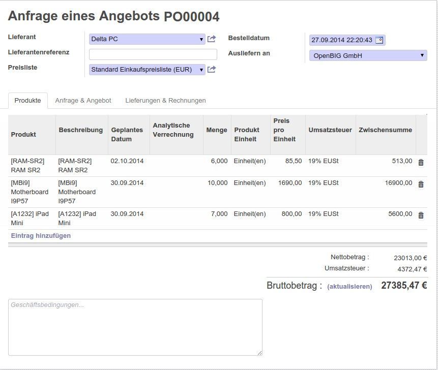Senden Sie Angebotsanfragen oder Beschaffungsaufträge mit einem Klick zu Ihren Lieferanten. Leiten Sie Wareneingänge und Eingangsrechnungen einfach von Ihren Beschaffungsaufträgen ab.
