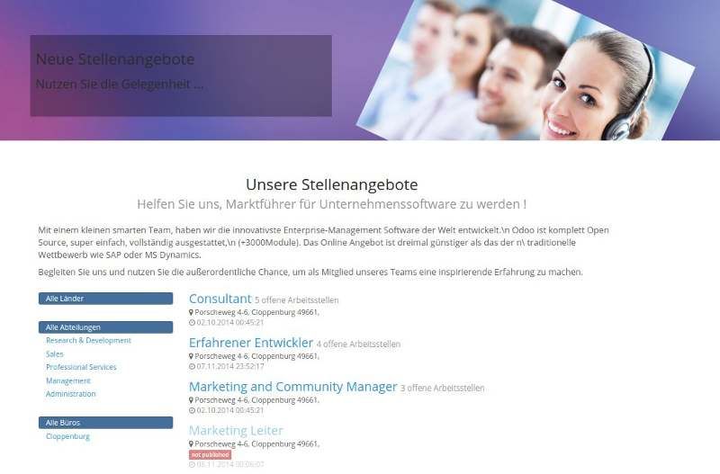 Mit Odoo können Sie Ihre Jobbörse verwalten und freie Stellen ausschreiben.
