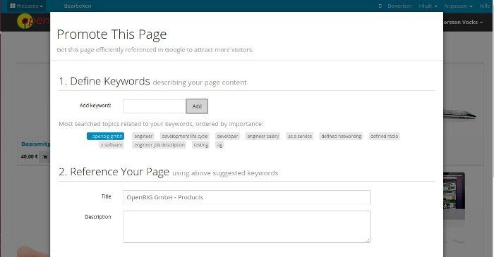Das “Promote”-Tool schlägt aus den bei Google meistgesuchten Begriffen passende Schlagwörter vor. Tools zur Suchmaschinenoptimierung sind ohne Konfiguration sofort einsatzbereit.
